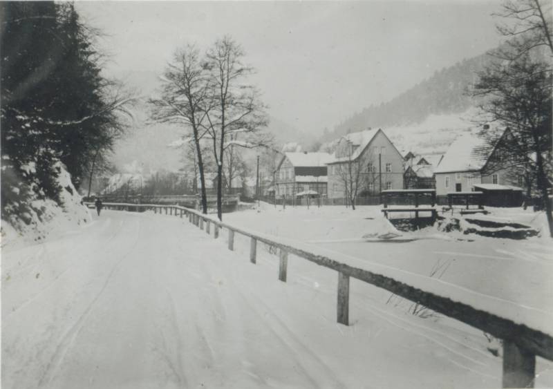 Das zugefrorene Wehr im Winter 1945