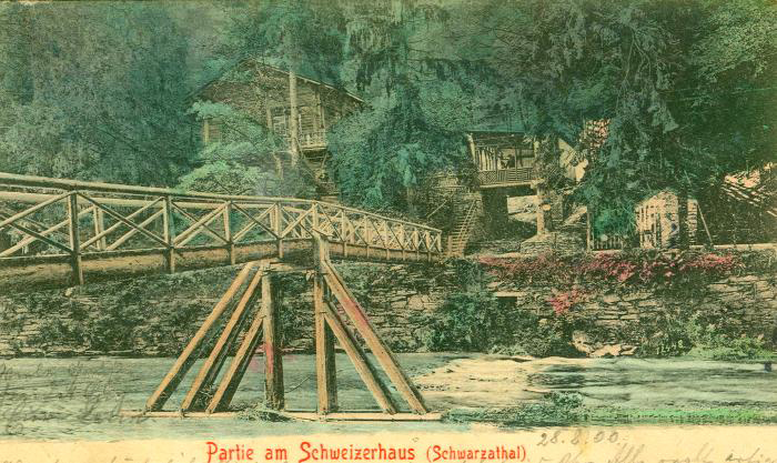 Die alte, hölzerne Brücke am Schweizerhaus 1900